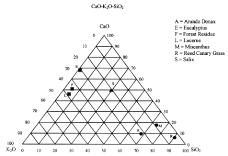 3. High potassium (K) and phosphorus ash content, with low fusion temperature derived from faecal matter such as poultry and cattle dung.